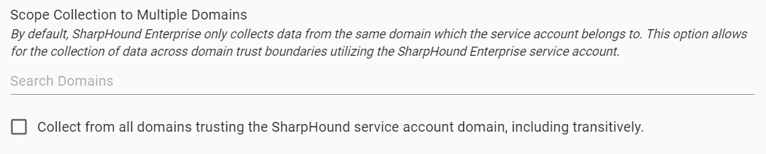 When configuring a SharpHound Enterprise client, it is possible to specify additional domains to be collected by entering domain names in “Scope Collection to Multiple Domains”. Alternatively, the SharpHound Enterprise client can collect from all domains trusting the service account domain by checking the option “Collect from all domains trusting the SharpHound service account, including transitively”. This option will also collect from trusting domains in other forests.