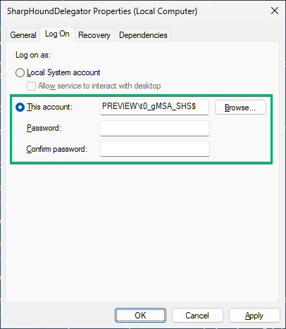 3. In the Log On tab, set This account to be the gMSA.