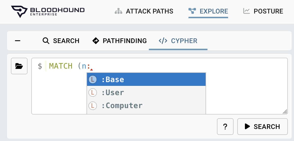 - Cypher syntax highlighting and autocomplete - Writing Cypher got significantly easier with syntax highlighting and autocomplete support. While typing a Cypher query, the editor will now display options to auto-complete in-progress words based on the BloodHound schema and highlight issues directly within the editor.